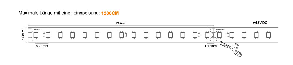 LED Streifen mit 48V für maximal 12 Meter mit einer EinspeisungLED Streifen 48V für Längen bis zu 12 Meter mit einer Einspeisung